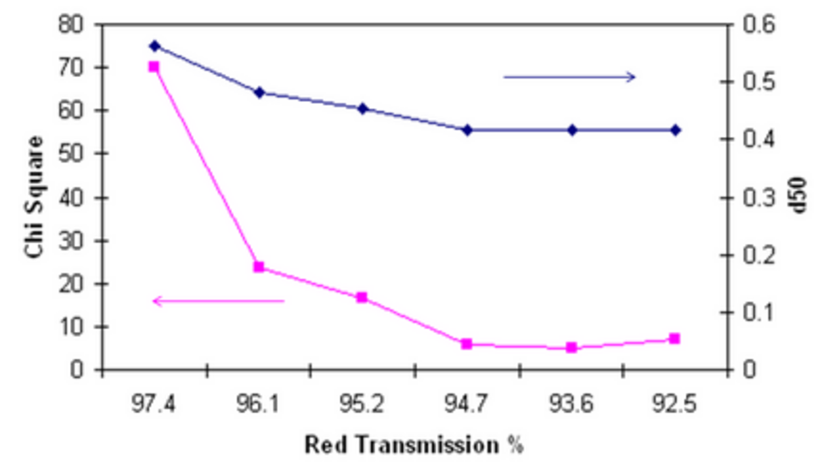 The LA-960 includes a Chi square error calculation that increases when there are fluctuations of light intensity on the detectors during the measurement. The Chi square value can be used to help choose the optimum concentration as show in the graph below. When the concentration is too low (high %T) the signal/noise ratio is high – creating a higher Chi square calculation. Once the %T falls below about 95 the Chi square value stabilizes, as does the reported D50 shown on the right Y axis.
