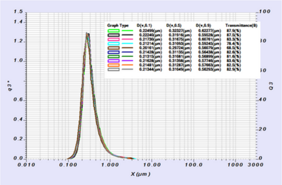 Note that the D50 result remains within specification down to 27.7 %T while the D10 falls out of specification at 58.1 %T. This exemplifies how multiple scattering effects smaller particles more dramatically. The second peak below 1 micron is an artifact of multiple scattering.