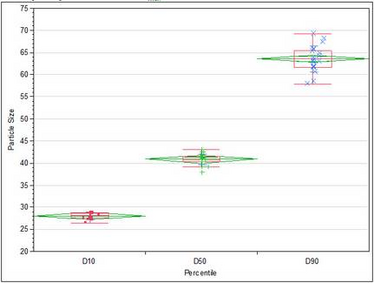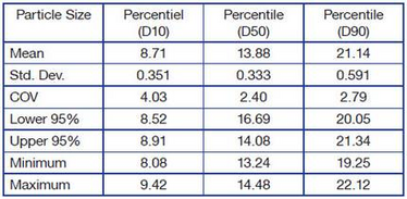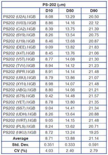 ISO 13320:2009 section 6.4 states that for the median size of the distribution the coefficient of variation should be less than 3%. Values at side of the distribution such as D10, D90, should have a coefficient of variation not exceeding 5%. PS-202 (3-30 µm) and PS-215 (10-100 µm) were tested with 20 units each. The coefficient of variance is 4.03%, 2.40% and 2.79% at D10, D50 and D90 for PS202, and 2.35%, 2.95% and 4.60% for PS215. All the results meet ISO 13320:2009 specification.