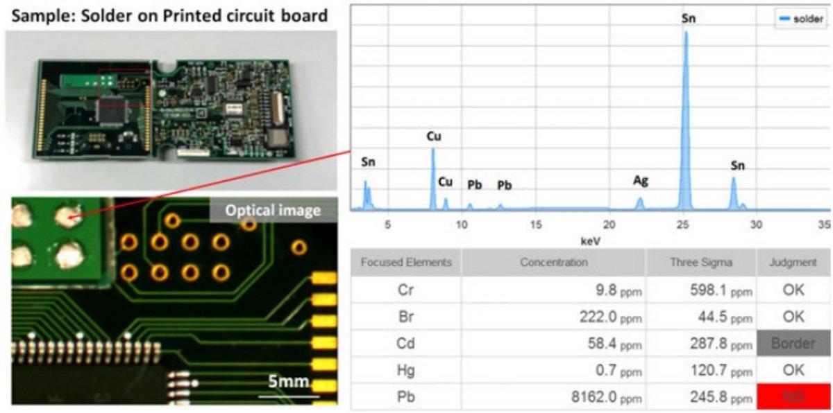 Simultaneous imaging of transmission X-rays and fluorescent X-rays is effective to find defects inside electronic components. The XGT-9000 Series is also an effective screening tool for RoHS testing. It can perform elemental mapping to find suspicious components on a complex sample, and analyze them to obtain the concentration of the elements regulated through RoHS. The XGT-9000 Series software can display compliance with the RoHS thresholds with a clear pass/fail result.