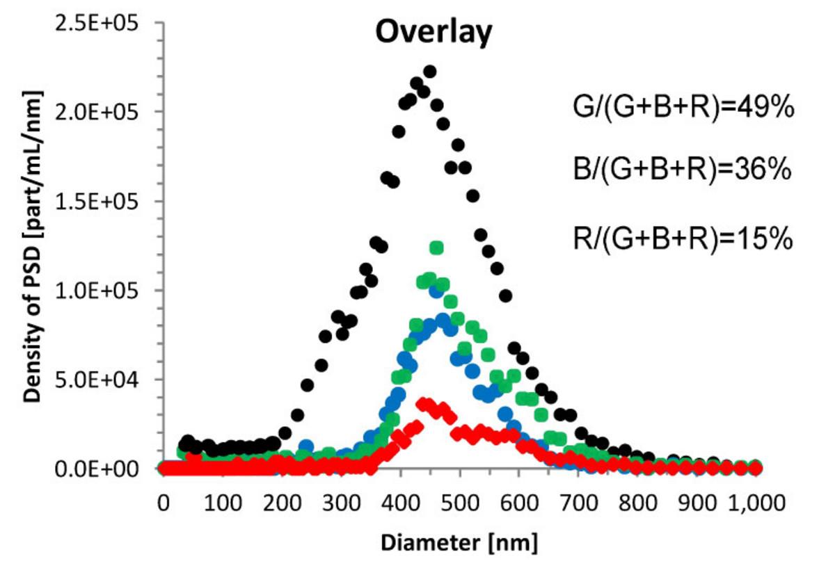 The ViewSizer’s proprietary multispectral illumination and detection enables unique capabilities in the field of fluorescent particle analysis. Now for the first time, customers can enumerate different constituents in the same sample under the same size distribution. The overlapped PSDs in the graph show how the ViewSizer can determine the concentration of each of the three constituents and their percentages of the total mixture. Imagine the possibilities – it’s like flow cytometry for nanoparticles.