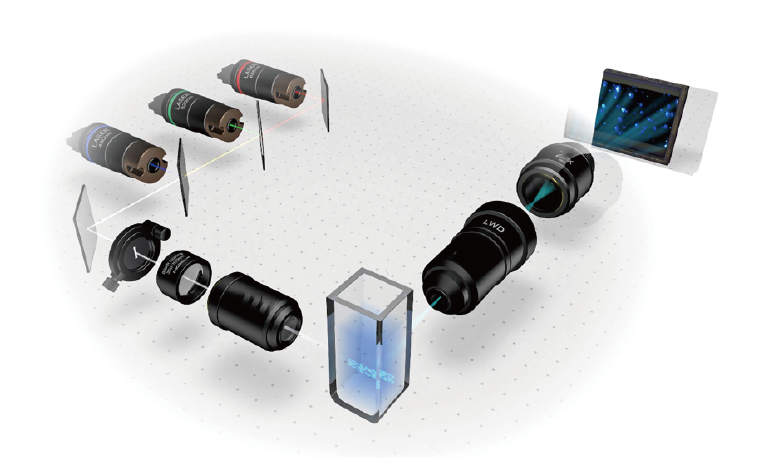 Plurality of light beams at different spectral wavebands is used to create one light sheet for illuminating nanoparticles in a liquid sample.