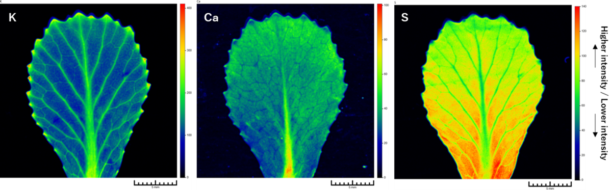 Elemental distribution images of Potassium (K), Calcium (Ca), and Sulfur (S) in a leaf from a brassica oleracea using a HORIBA XGT-9000 X-ray Analytical Microscope (Potassium (K): Higher intensity in veins and the midrib. Calcium (Ca): Higher intensity in the midrib. Sulfur (S): Higher intensity at the blade area.)