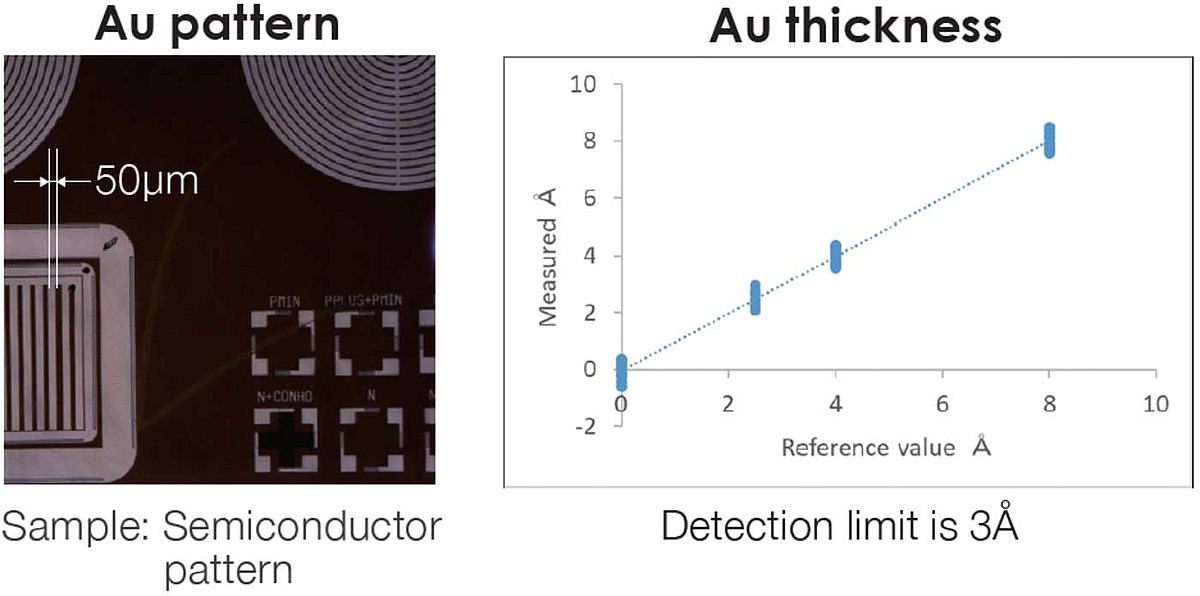The combination of microbeam and thickness measurement capability makes the XGT-9000 a useful tool for the QC of semiconductors, which feature thin and narrow patterns. Thickness sensitivity depends on elements traced, but can be at the Angstrom level.