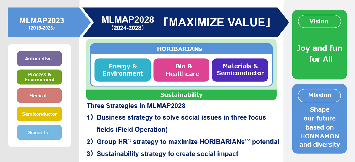 HORIBA has launched a new Mid-Long Term Management Plan “MLMAP2028”. With the slogan “MAXIMIZE VALUE*2,” HORIBA aims to implement its vision “Joy and Fun for All” by executing the following three strategies.