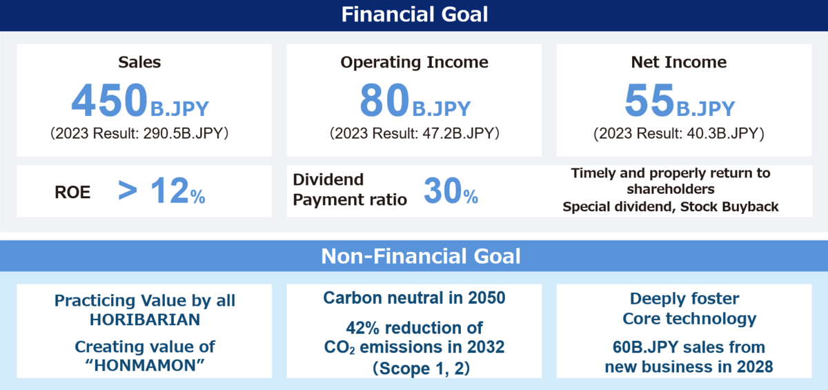 As a first step toward achieving the vision “Joy and Fun for All,” HORIBA has launched a new Mid-Long Term Management Plan, MLMAP2028, with the slogan “MAXIMIZE VALUE,” to further grow our business and increase corporate value. Deploying three strategies stated below, HORIBA aims to achieve net sales of 450 billion yen, operating income of 80 billion yen, and ROE of 12% or more in the target year of 2028.